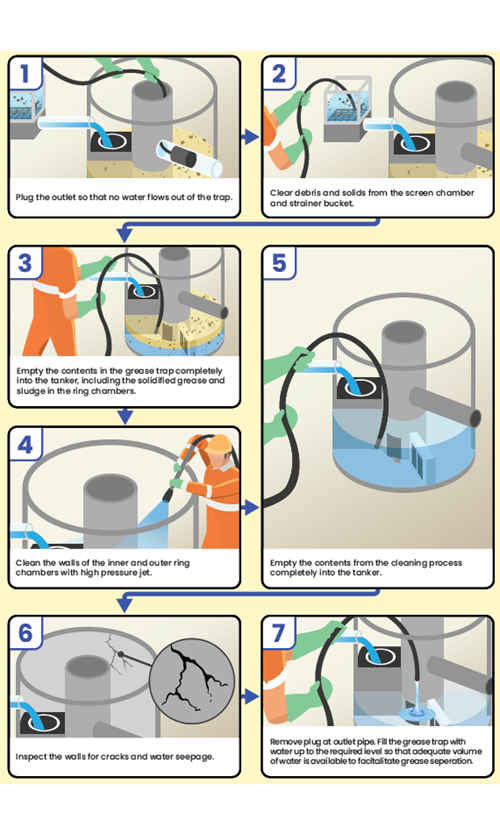 STEP 1: You need to check that your contractor is carrying out the cleaning task in accordance to PUB’s recommended steps for cleaning grease traps.