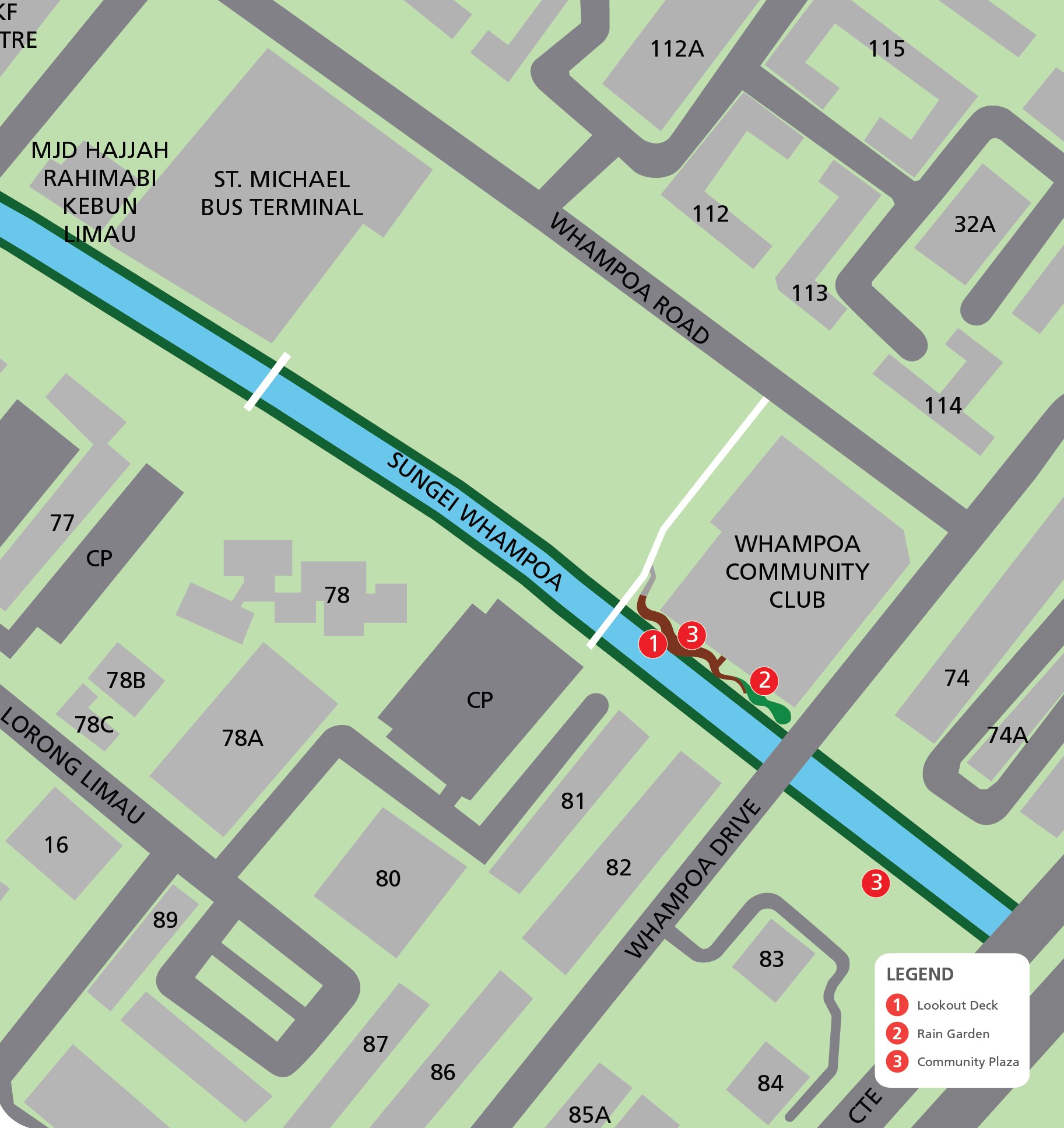 A 450-metre stretch of Sungei Whampoa between Kim Keat Road to CTE has been enhanced to provide a better experience for residents, bringing them closer to water. The area adjacent to the Whampoa Community Club (CC) has been transformed into a node for community bonding. New features at this node include a boardwalk connecting residents from the CC to a lookout deck that overlooks the scenic waterway. Additional seating spaces and footpaths have been created for communal bonding and accessibility. ABC Waters Design Features such as rain gardens have been incorporated to help cleanse rainwater runoff from the CC, using specially-selected plants and soil media before it goes into the waterway. The rain gardens not only beautify the environment and promote biodiversity in the area, they also provide learning opportunities for residents and students to better understand rainwater runoff treatment.