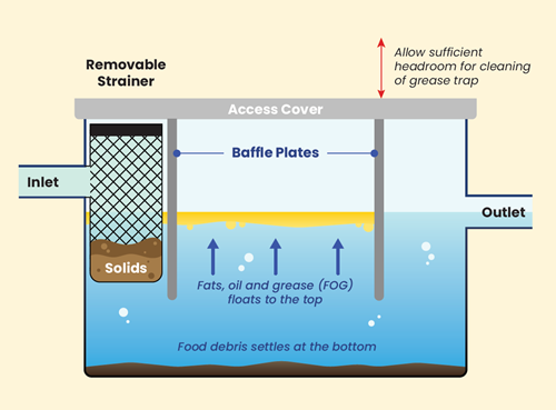 A grease trap is any interceptor, arrestor, tank, or pit situated above or under the ground that allows cooling and separation of grease from used water. Fat, oil, and grease discharged from food establishments are major causes of blockages in the public sewerage system. Without a properly sized and maintained grease trap, grease will enter the sewers and accumulate. This will result in encrustation, which will obstruct the smooth flow of used water in the sewers and cause it to overflow into your premises or other public areas.