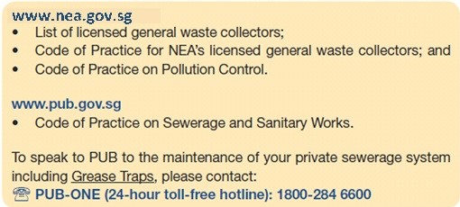 Alternatively, to speak to PUB on the maintenance of your private sewerage system including Grease Traps, please contact: PUB-ONE (24-hour toll-free hotline): 1800-2255-7821800-2255-782