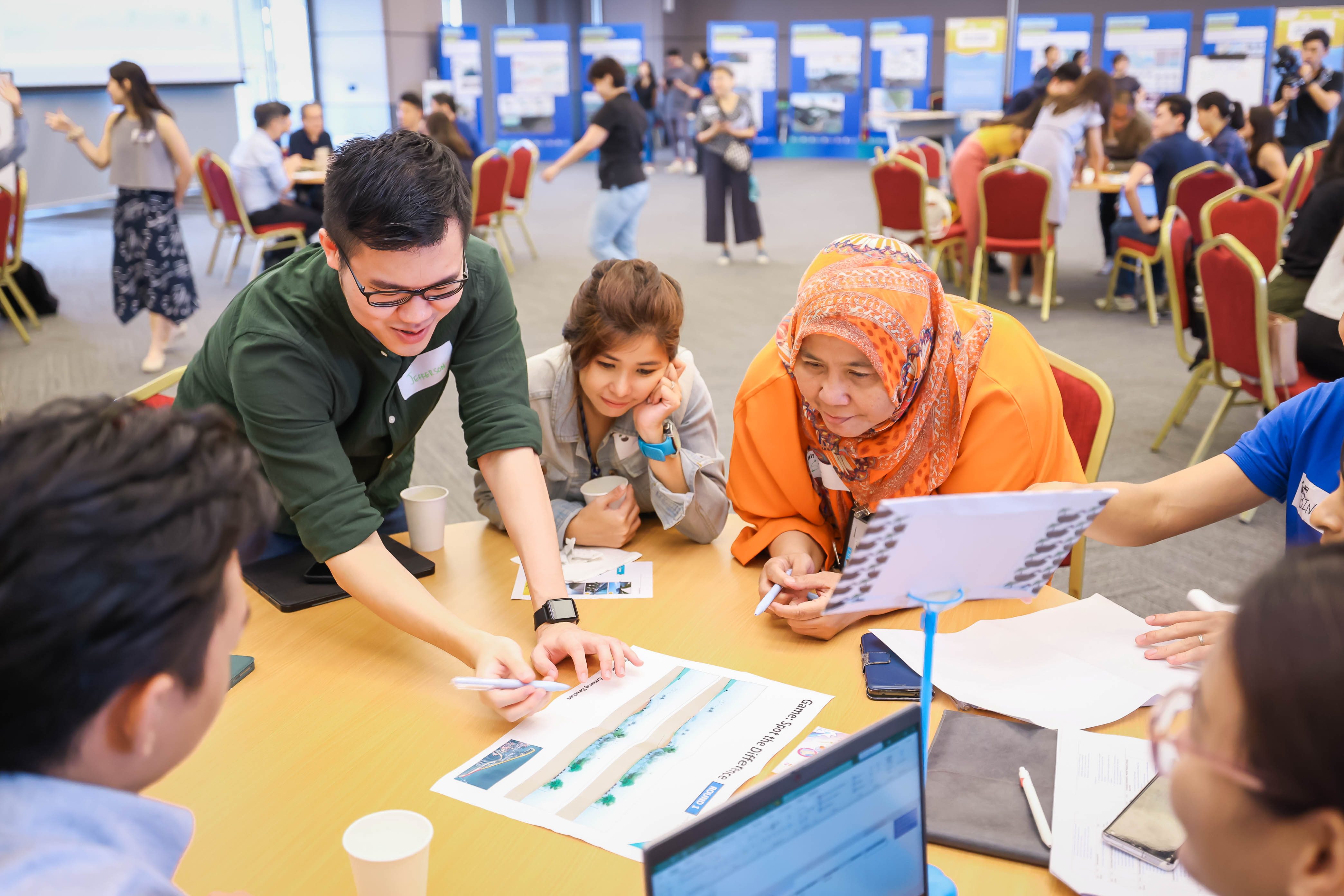 Senior Parliamentary Secretary Baey Yam Keng (Ministry for Sustainability and the Environment & Ministry of Transport; centre in photo) listening in to the participants’ discussion on the trade-offs of potential coastal protection measures.