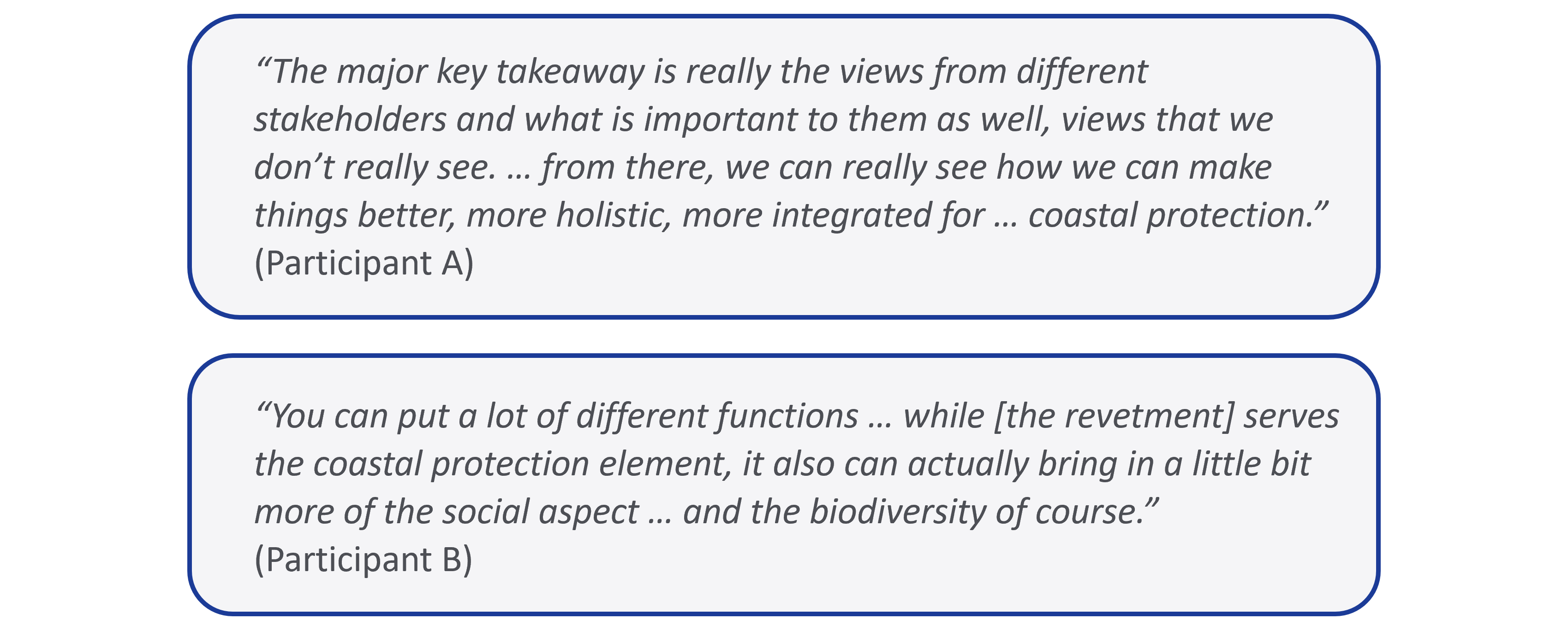 The discussions were robust and engaging, with participants deliberating on the possible coastal protection options at Changi and the Greater Southern Waterfront coastline. Through the exchange of perspectives from a diverse range of stakeholders, participants were of the view that no single coastal protection measure will meet the various needs and uses of the coastal areas. Nevertheless, they agreed there is potential for multi-functional coastlines, which could be realised with prudent long-term planning that incorporates stakeholders' views and inputs.