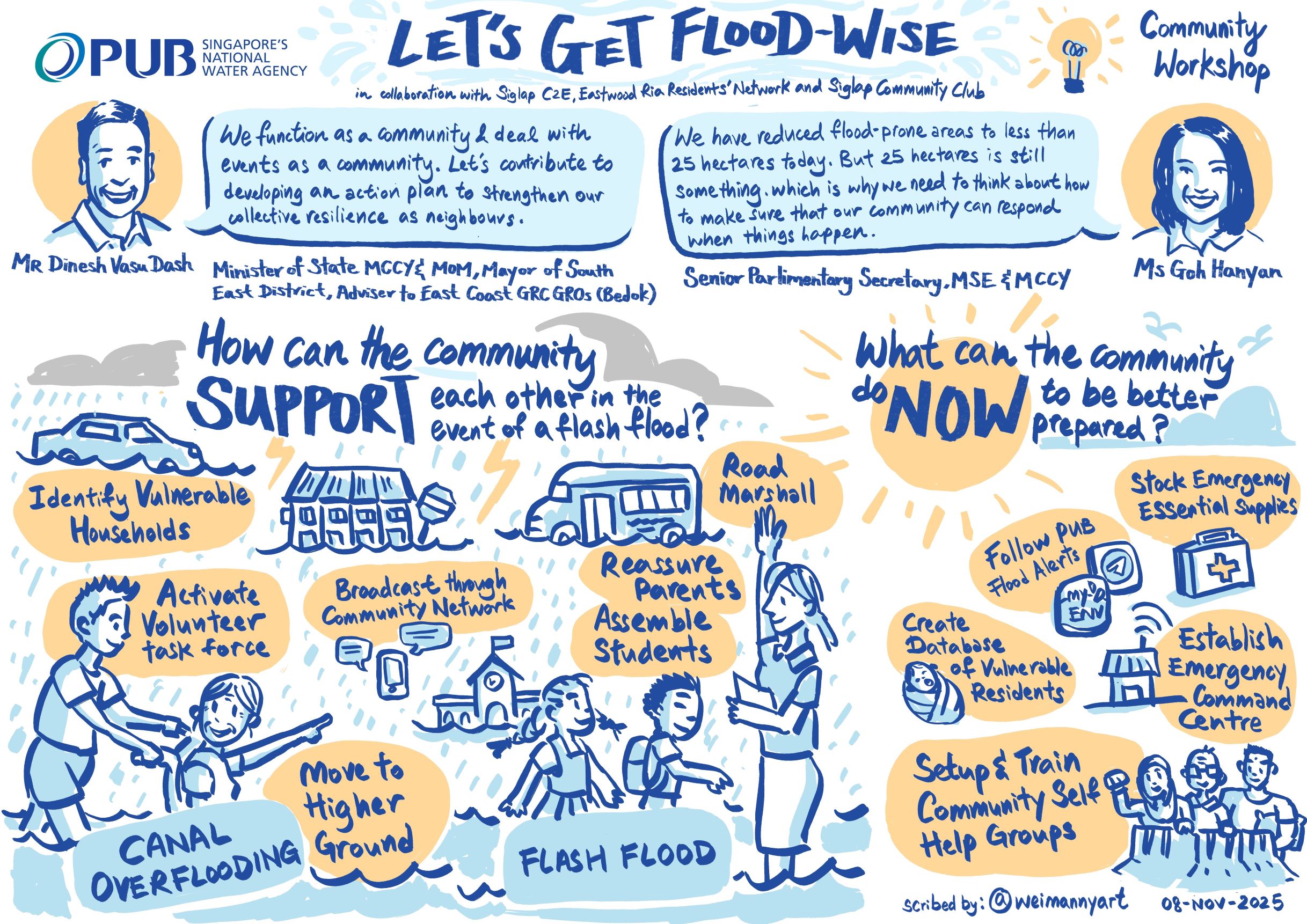 When flash floods strike, every second counts — and communities that are prepared make all the difference. That’s why PUB, together with the Siglap Community Emergency and Engagement Committee (C2E), Eastwood Ria Residents’ Network and Siglap Community Club, held the Let’s Get Flood-Wise Community Workshop on 8 November 2025. Over 20 community leaders, volunteers and residents came together with a shared mission to explore how the neighbourhood can stay ready and respond effectively when flash floods occur.