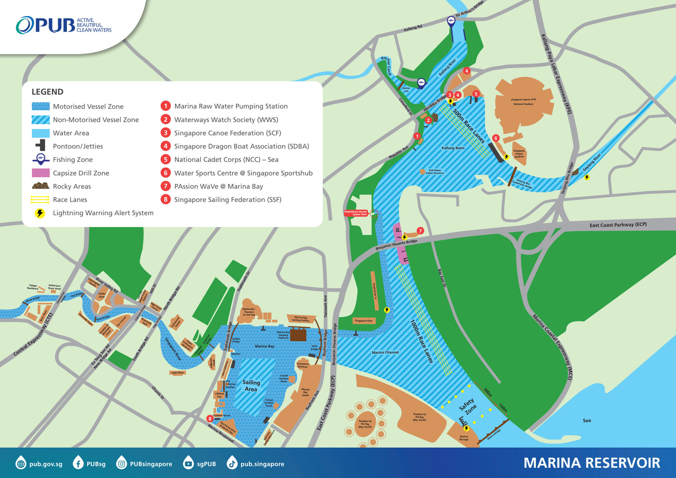 To view the 1-Star paddling zoning in Marina Reservoir, click here. 2-Star paddling zone is extended to the areas highlighted in green.