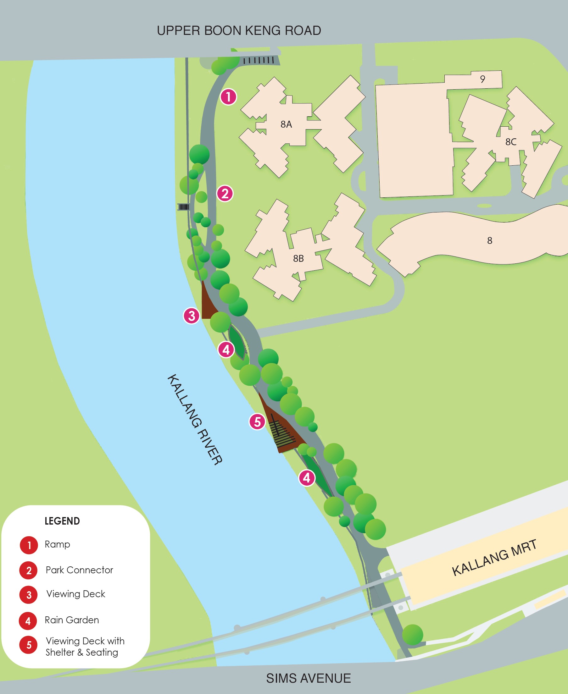 This project is integrated with the Housing & Development Board’s housing development adjacent to Kallang River and the National Parks Board’s park connector expansion to a 15m wide promenade for pedestrians and cyclists. The promenade has been enhanced with greenery and additional communal spaces such as lookout decks have been created to bring people closer to water. ABC Waters Design Features such as rain gardens have been incorporated to help cleanse rainwater runoff before it goes into the river and Marina Reservoir.