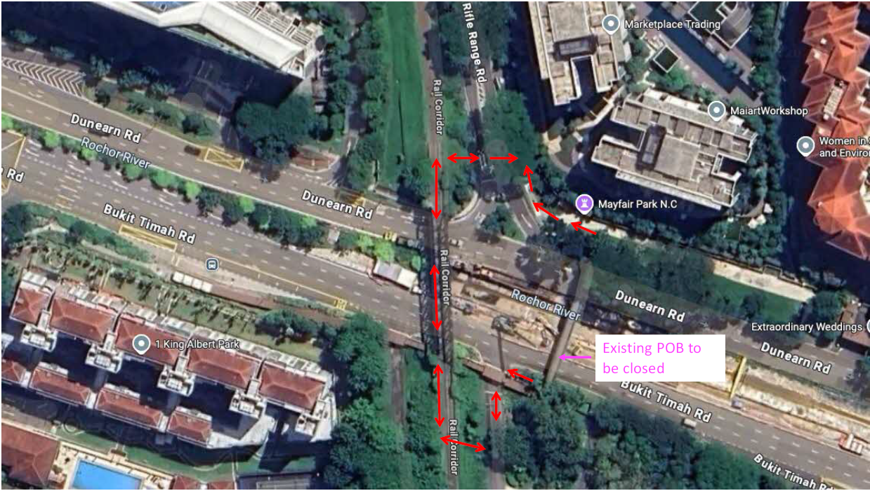 The temporary closure is for the removal of an existing pedestrian overheard bridge (POB) near Rifle Range Road, to facilitate PUB’s ongoing drainage upgrading works along Bukit Timah Canal. Pedestrians can use the Rail Corridor Truss Bridge as a temporary crossing until the replacement POB is completed in the second quarter of 2026.