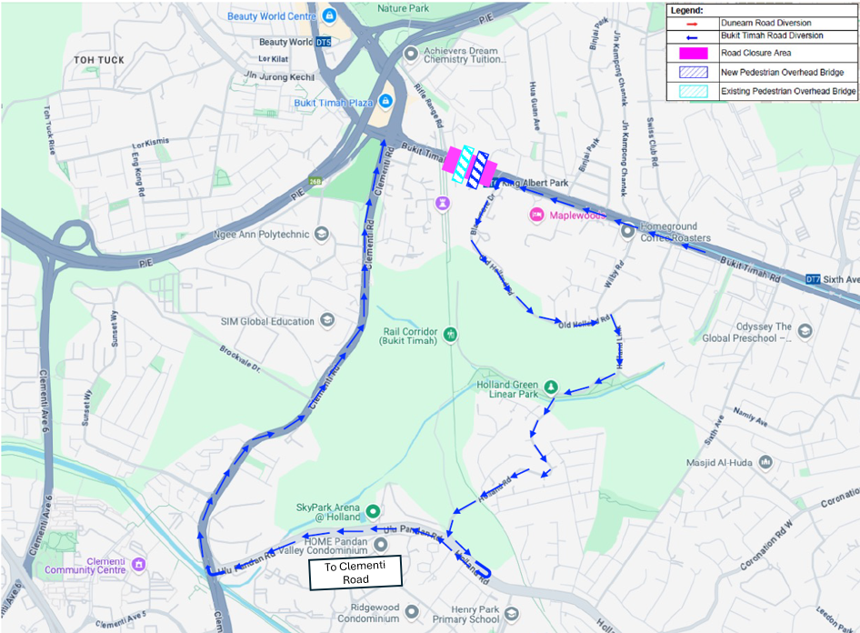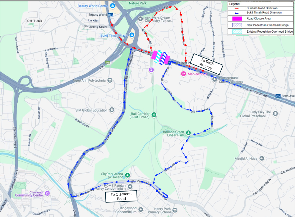 Motorists headed towards Sixth Avenue are advised to use the alternative route via Rifle Range Road towards Hua Guan Avenue. Those travelling towards Clementi Road will need to make a detour via Blackmore Drive Road and Old Holland Road towards Ulu Pandan Road, before joining up at Clementi Road to return to Bukit Timah Road.