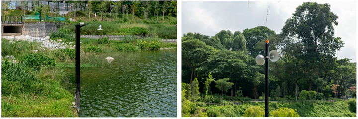 A water level sensor in the lake (left) and the public broadcast system (right)