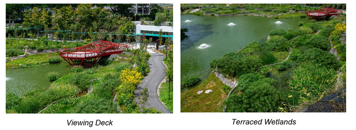7 To ensure good water quality in the lake, the terraced wetlands and swales help to cleanse and filter pollutants from stormwater runoff. Gross Pollutant Traps (GPT) are installed to trap litter and silt that are accumulated in the runoff, while aerators within the lake improve water circulation and increase the amount of dissolved oxygen in the water (refer to Annex C for key features).