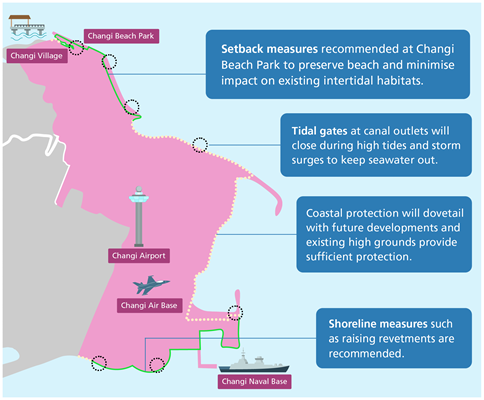 8 Changi’s coastline features recreational spaces such as Changi Beach Park, as well as industrial and aviation facilities such as Changi Aviation Park and Changi Airport. The recommended coastal protection measures for Changi’s coastline include a mix of bunds, revetments, and tidal gates.